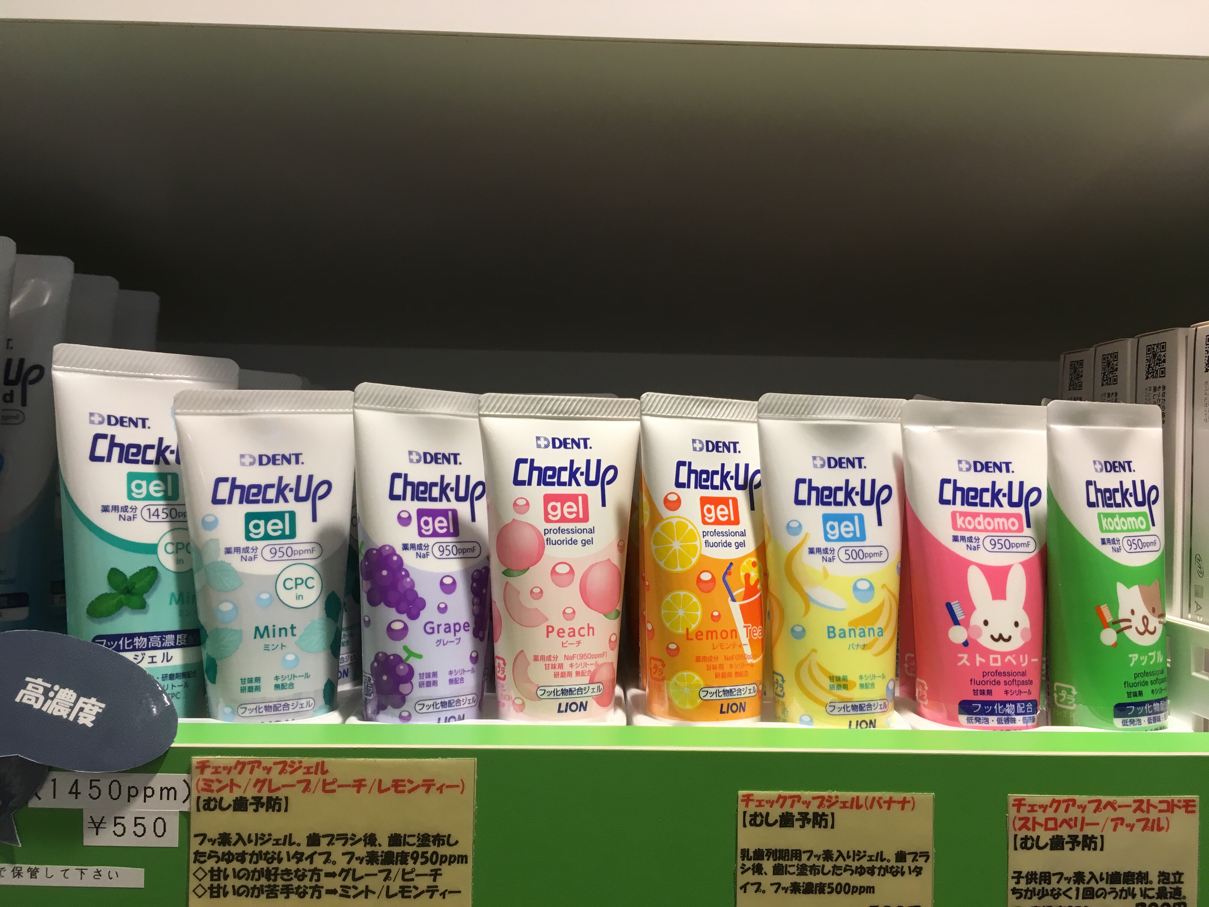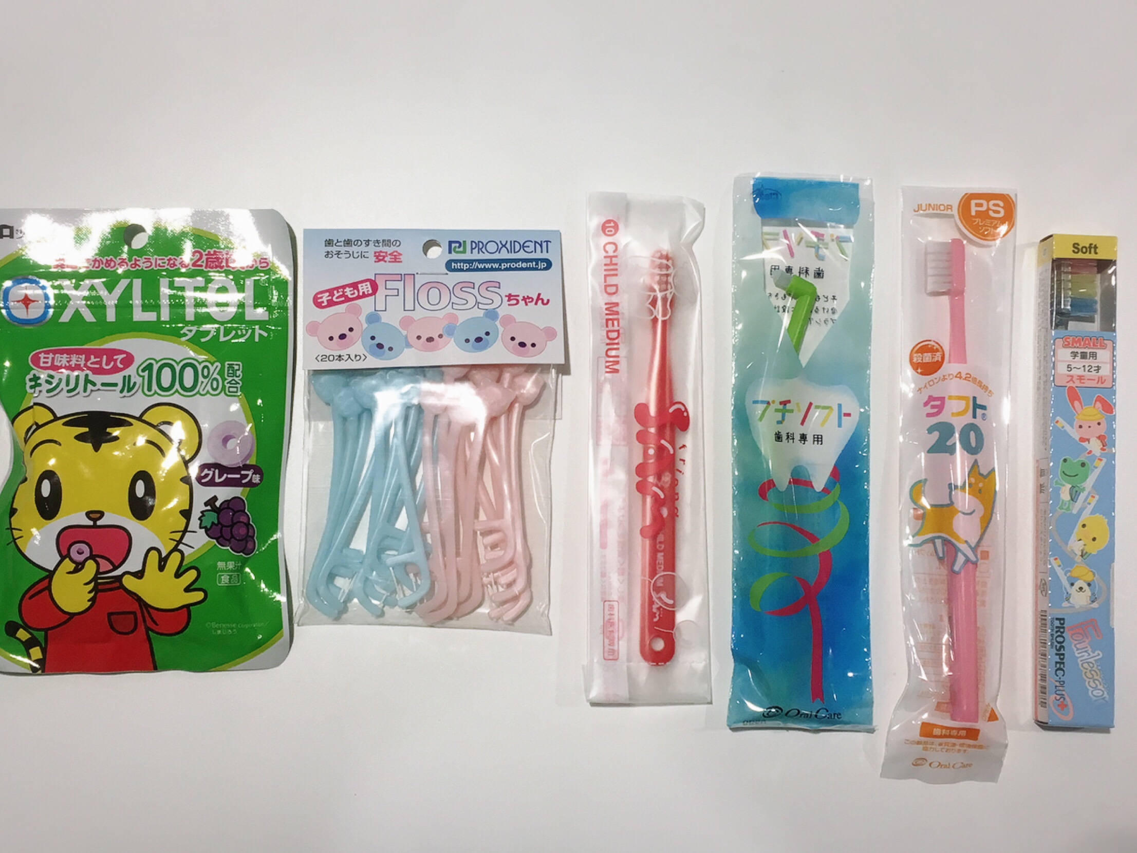 歯ブラシは年齢に合わせて4種類、歯磨きジェルも7種類、置いています。