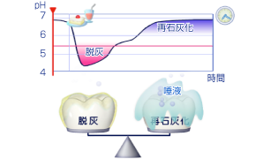 汚いと思われがちな唾液には歯を守ってくれる力があるのです。お口の中はもともと中性を保っていますが、食べ物を食べる度にお口の細菌が食べ物を分解し、炭水化物を栄養素に酸を吐き出します。すると、中性だったお口の中は酸性に傾き、歯を形作るミネラルが解け始めます。これを脱灰と言います。脱灰が続いてしまうと穴が空いてしまいますが、それを防いでくれるのが唾液なのです。唾液は歯の表面を中性に戻す働きを持っています。表面が唾液に浸され中性に戻ると、歯はミネラルを取り戻します。これを再石灰化と言います。このように、歯は食事をする度にミネラルが溶け出す脱灰と、唾液によってミネラルが取り込まれる再石灰化を繰り返しているので、このバランスを崩さなければむし歯を防ぐことができるのです。