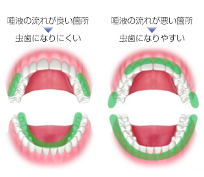 むし歯はどこにでも同じようにできる訳ではありません。部位特異性と言ってむし歯になりやすい場所となりにくい場所があるのです。それは主に歯の質と唾液の影響があります。歯はエナメル質という硬い組織で覆われていますが、歯ぎしりや歯ブラシ圧の強さなど、何かしらの影響でエナメル質が削れてしまい、その下の象牙質が露出してしまうことがあります。象牙質はエナメル質と違いとても酸に弱く溶けやすいところです。唾液の流れが良いところでは、歯の質の弱点はあまり問題になりませんが、唾液の流れが悪い部分は、唾液の流れが良い場所に比べると非常にむし歯になりやすいのです。唾液の流れが良い場所では、常に唾液によって汚れを洗い流す作用が働き、作られた酸はすみやかに中和されます。その結果、脱灰の時間が短く再石灰化されている時間が長いので、むし歯になりにくいのです。一方唾液の流れが悪いところは、糖分が洗い流されにくくなり作られた酸が中和されないため、細菌が増殖しやすくなります。その結果、脱灰している時間が長く、再石灰化している時間が短いのでむし歯になりやすいのです。