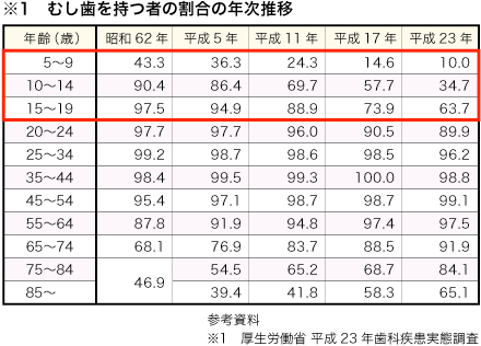 近年では、むし歯は減少傾向にあります。(※1)しかし、成長するにつれてむし歯の数が増加する傾向は以前と比べてそれ程変わっていません。むし歯が増加する理由としては、部活動の始まりや受験勉強、交友関係の広がりから生活習慣が変わり、歯磨きの習慣や食生活の乱れなどによるものと考えられます。U-20では、0歳から20歳になるまでむし歯と歯周病のない健康な口腔内を作り、大人になっても歯に困らない健康な口腔内の状態が維持できるように努めます。