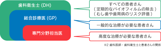 一般医科では内科、外科、眼科、耳鼻科など、各専門分野に分かれています。欧米では歯科においても、より高度な治療や難易度の高い治療においては、総合診療医(GP)から専門分野担当医に依頼する専門医制度が確立されています。当院でも世界水準の医療に近づけるべく、各専門分野の担当医(インプラント治療、歯周治療、補綴治療、小児治療、根管治療、口腔外科治療、矯正治療)へ必要に応じて依頼し、より質の高い医療を提供することを目指しています。重要なことは、かかりつけの歯科衛生士(DH)と総合診療医(GP)を持ち、普段から自分自身の口腔内を十分に把握してもらうことです。(※2)そうすることによって、いざ治療が必要となった場合、高度な医療が必要か否かを見極めることができ、最適な治療を受けることができます。